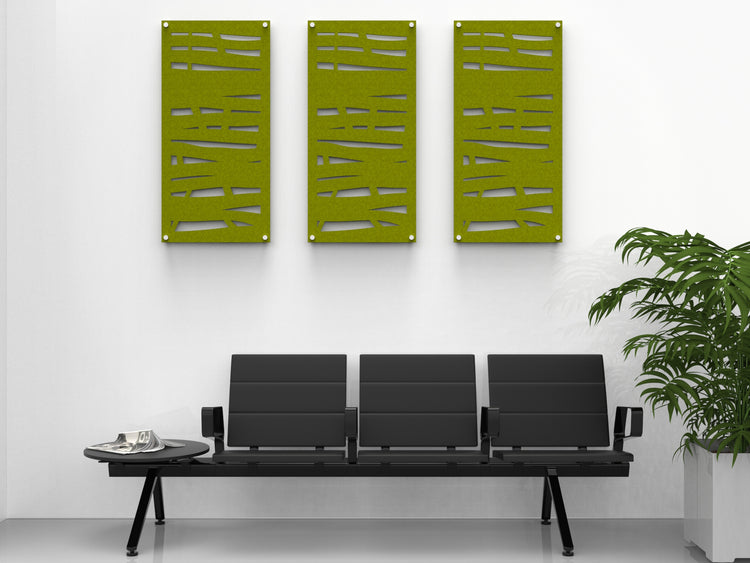 Overgrowth is an acoustic panel mounted with stainless steel standoffs. Made with acoustical felt, the panel absorbs sound echo and reverb.