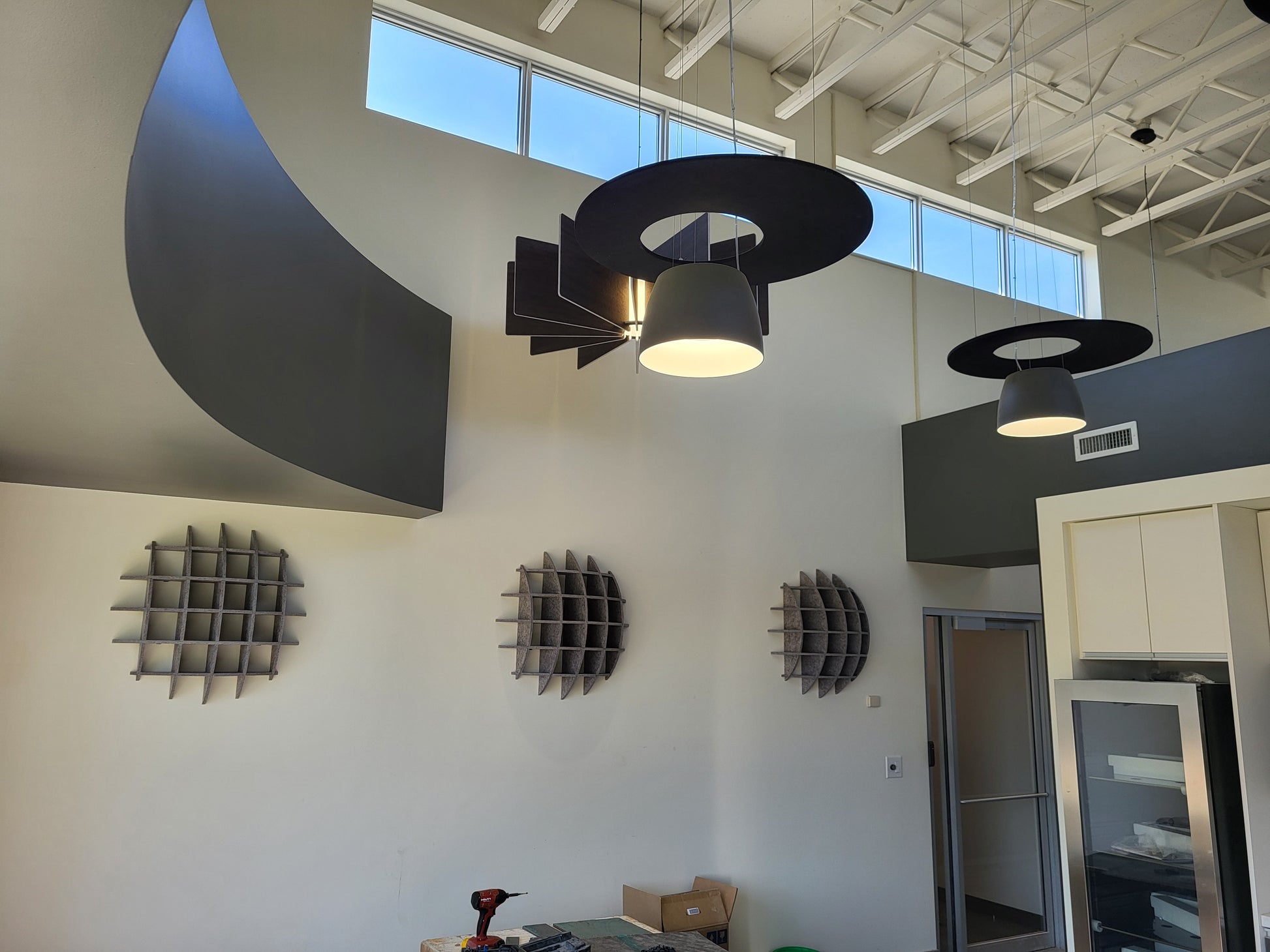 The nested felt panels diffuse and absorb excessive sound reflections that are harsh on the ears.