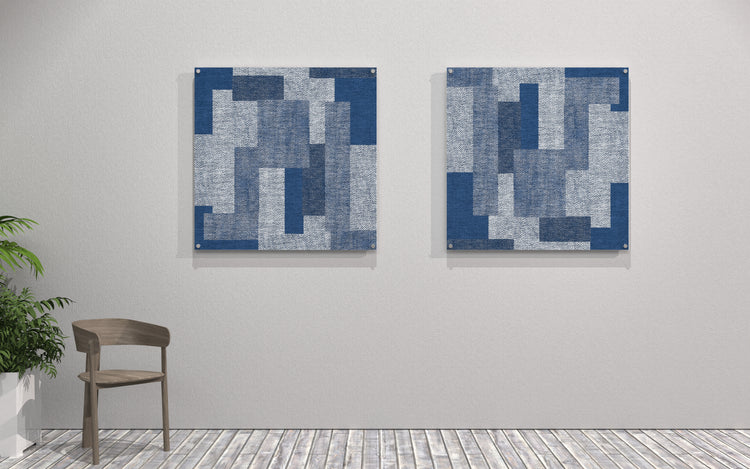 This 4x4 printed acoustic panel features an abstract denim block design. The design is printed on white acoustic felt to reduce echo and reverb in your space.