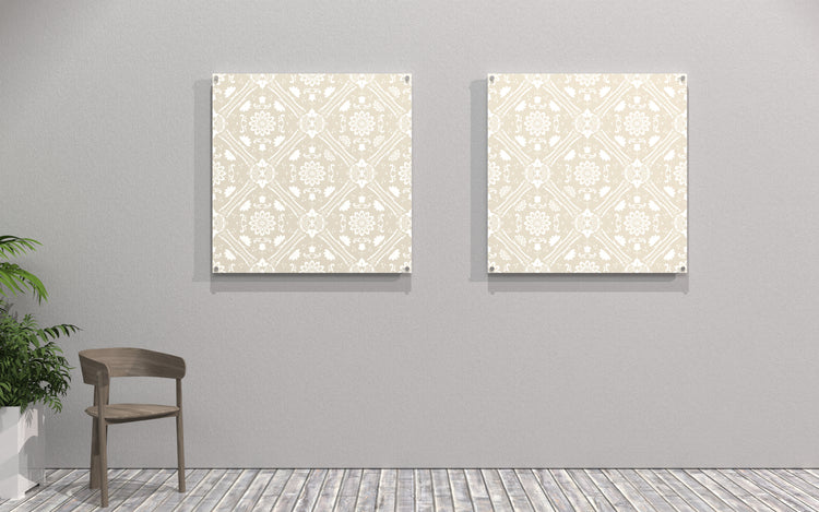 This 4x4 printed acoustic panel features light beige flowers and sparkles on a dark beige background. The design is printed on white acoustic felt to reduce echo.