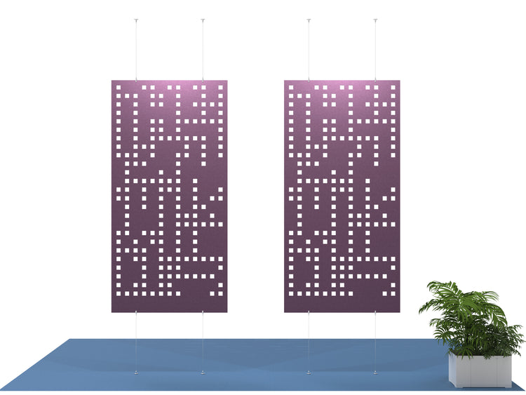 Punch Card is constructed with acoustic felt to reduce echo and provide privacy in open spaces. The divider suspends from the ceiling and can be optionally fastened to the floor.