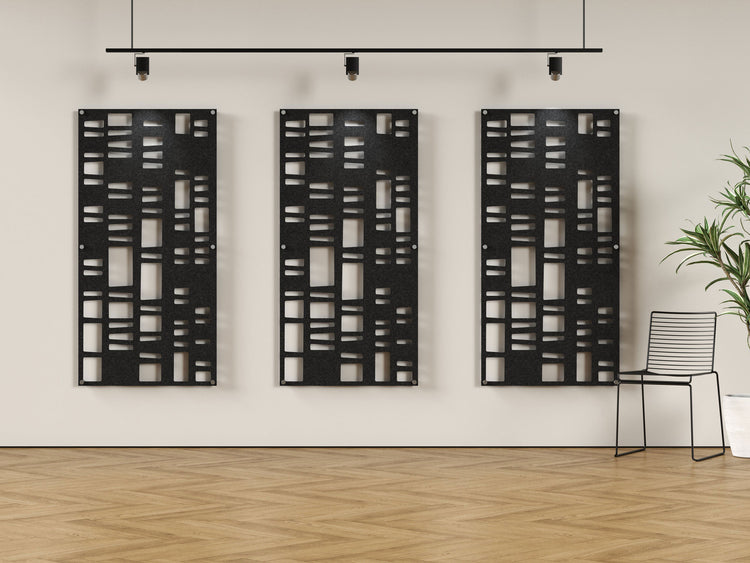 Abandoned Fence is an acoustic felt panel with irregular rectangle cutouts. Mount this 4x8 panel with standoffs to reduce echo and reverb in your space.