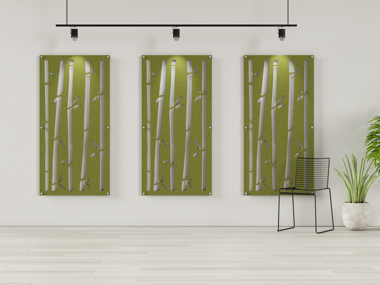 Bamboo is an acoustic felt panel with 5 bamboo stem and leaf cutouts. Mount this 4x8 panel with standoffs to reduce echo and reverb in your space.