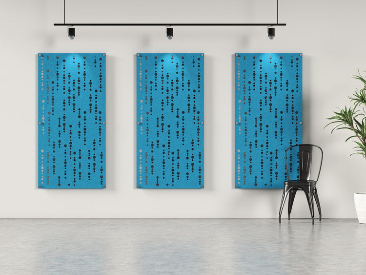 Bubbles is an acoustic felt panel with strings of circle cutouts. Mount this 4x8 panel with standoffs to reduce echo and reverb in your space.