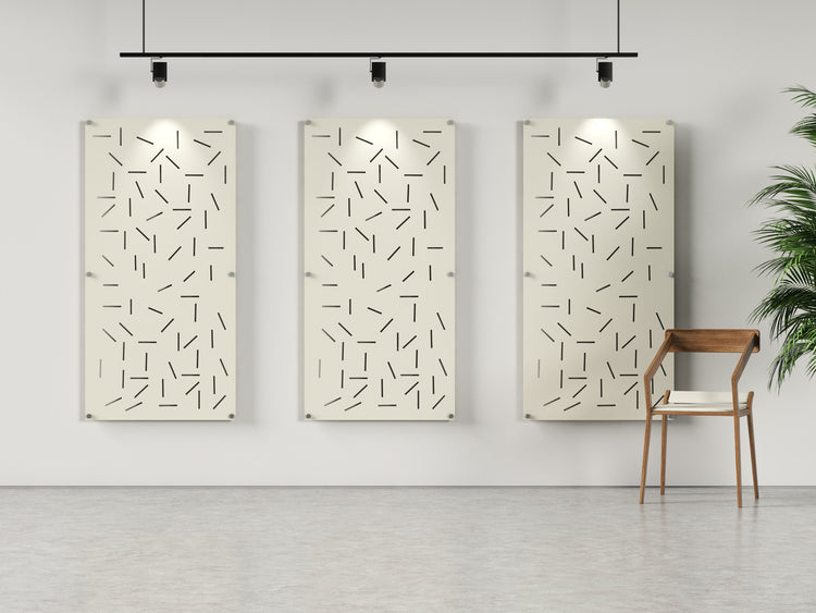 Cosmic Sprinkles is an acoustic felt panel with random thin strips of cutouts. Mount this 4x8 panel with standoffs to reduce echo and reverb in your space.