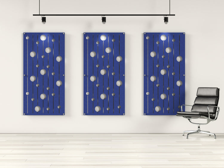 Descending Circles is an acoustic felt panel with circular and linear cutouts. Mount this 4x8 panel with standoffs to reduce echo and reverb in your space.