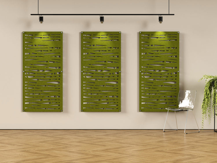 Overgrowth is an acoustic felt panel with cutouts that resemble a lush jungle. Mount this 4x8 panel with standoffs to reduce echo and reverb in your space.