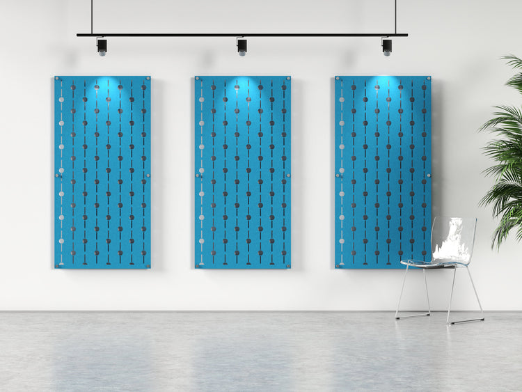 Racing Dots is an acoustic felt panel with strings of circle cutouts. Mount this 4x8 panel with standoffs to reduce echo and reverb in your space.