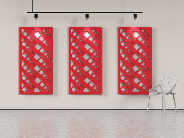 Squares On 45 is an acoustic felt panel with cutouts tilted at 45 degree angle. Mount this 4x8 panel with standoffs to reduce echo and reverb in your space.
