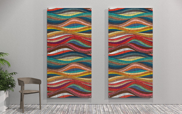 This 4x8 panel features colorful waves printed on white acoustic felt. The acoustic panel is mounted with standoffs to absorb echo and reverb from your walls.