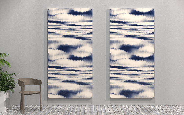 This 4x8 panel features light beige and navy blue waves, printed on white acoustic felt. The acoustic panel is mounted with standoffs to absorb echo and reverb from your walls.