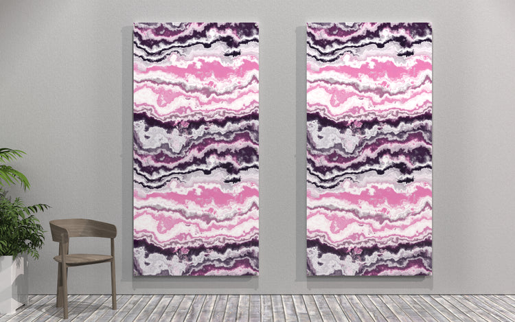 This 4x8 acoustic panel features a pink and purple geode print. The print is done on white acoustic felt to absorb echo and reduce reverb.