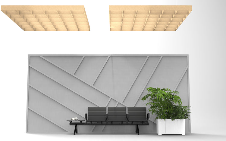This Coffered Grid has 36 cells in a 92" x 92" x 5.75" finished size. The grid is made of interlocking acoustic felt panels to absorb echo and reverb.