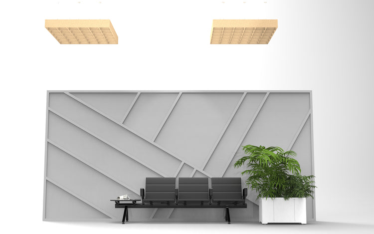This Coffered Grid has 36 cells in a 46.25" x 46.25" x 5.75" finished size. The grid is made of interlocking acoustic felt panels to absorb echo and reverb.