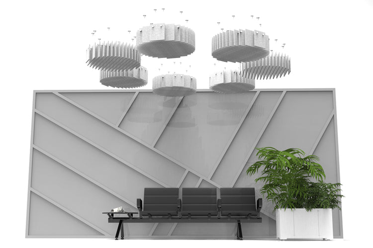 This Comb Baffle Assembly is 23" in diameter, 8.75" tall. It contains 16 baffle blades made from acoustic felt to reduce sound echo and dampen reverb.