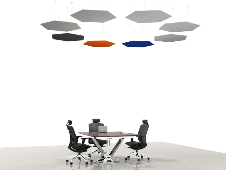 This 46-3/8" wide Hexagon Cloud is made from two layers of acoustic felt. Install onto ceilings to reduce echo and dampen reverb. Price is per cloud.