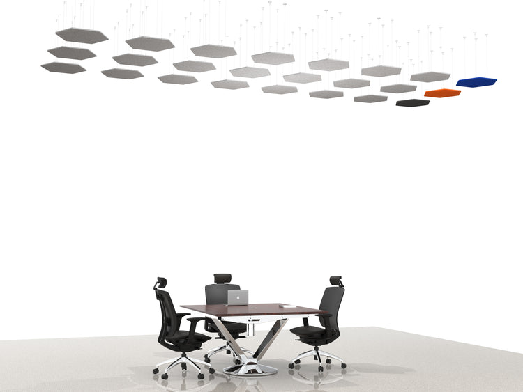 This 22-3/4" wide Hexagon Cloud is made from two layers of acoustic felt. Install onto ceilings to reduce echo and dampen reverb. Price is per cloud.